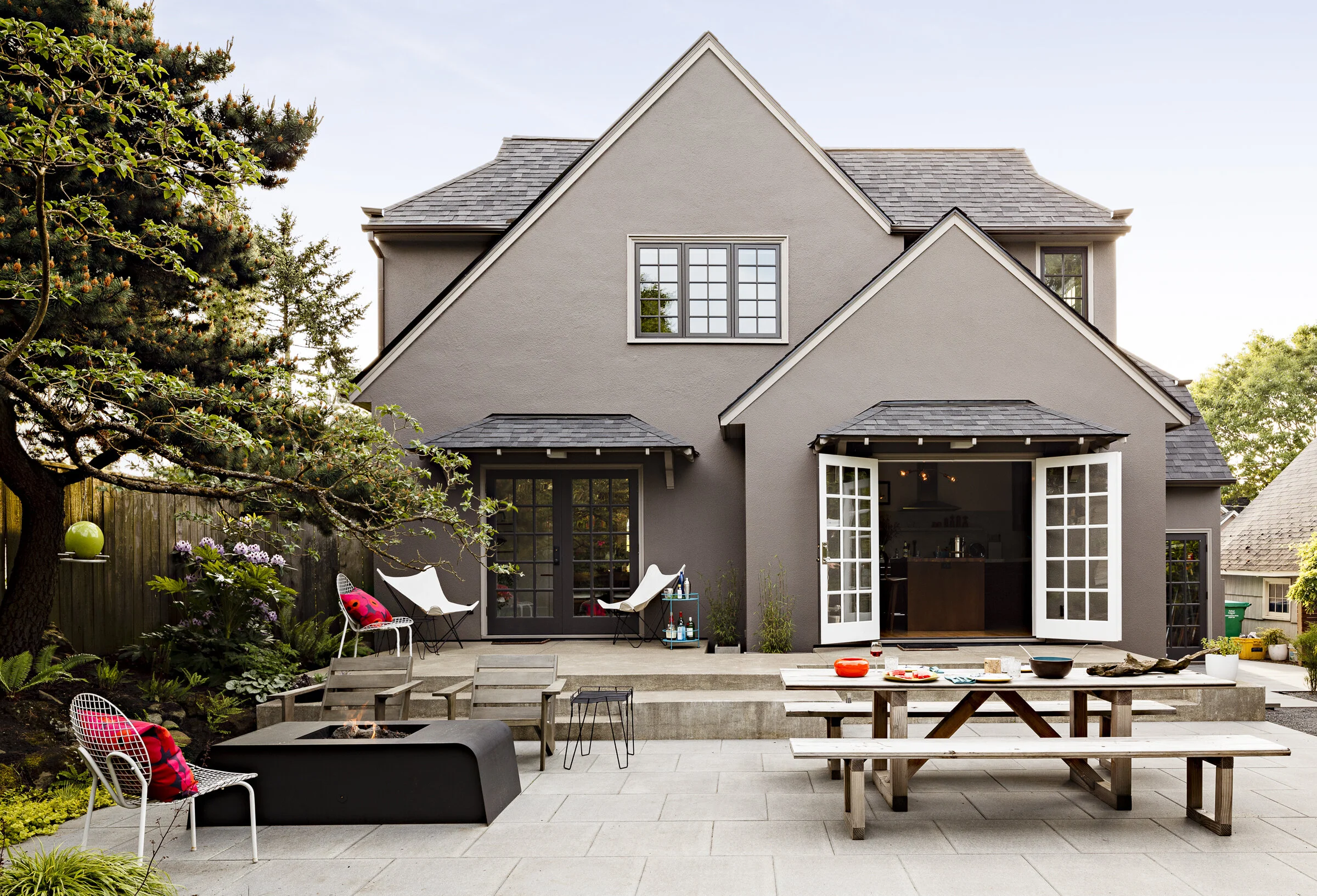 By stripping away layers of past renovations and enlarging key areas of the house, we took a tired and worn 1920’s Tudor style home and transformed it into a home that maintains beautiful period details while seamlessly integrating a more modern approach to living. A two-story addition off the back of the house allowed for a larger kitchen that could open up to the yard and a small owners’ suite was added on the second floor. The patio off the back of the house gradually steps down into the yard where outdoor rooms were created for entertaining and playing.